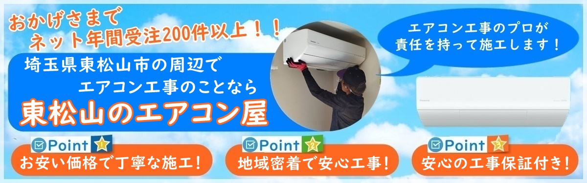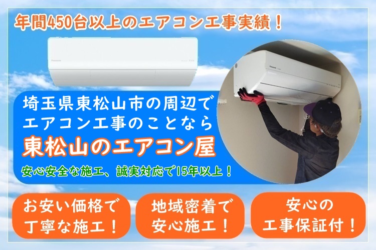 東松山のエアコン屋は家庭用のエアコン工事を主にエアコン取り付け・取り外し工事をおこなっている地域密着のエアコン業者で、東松山市を中心に埼玉県で活動しております。